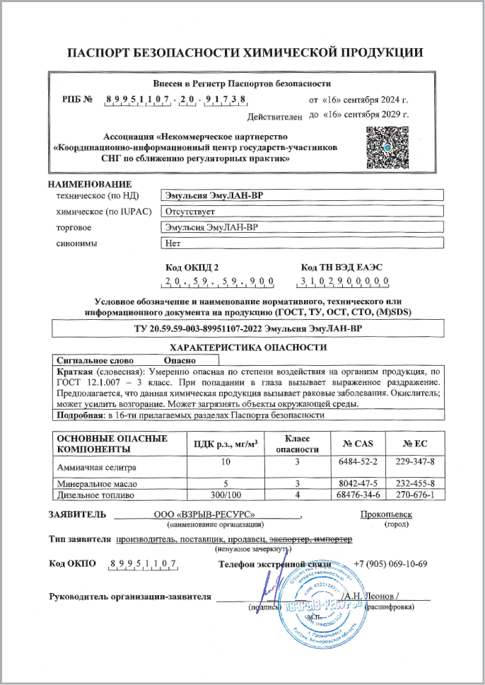 Изготавливается из смеси водного раствора аммиачной селитры и топливного раствора (минеральное масло, дизельное топливо, эмульгатор) по ТУ 20.59.59-003-89951107-2022 и применяется в качестве компонента для изготовления промышленных ЭВВ “ЭмуЛАН-ВР”. Эмульсия является невзрывчатым компонентом ЭВВ, обладающая устойчивостью к воздействиям (трение, удар, открытое пламя и другим механическим воздействиям). Взрывчатые свойства эмульсия приобретает в процессе химической сенсибилизации при изготовлении ЭВВ “ЭмуЛАН-ВР” непосредственно в скважине