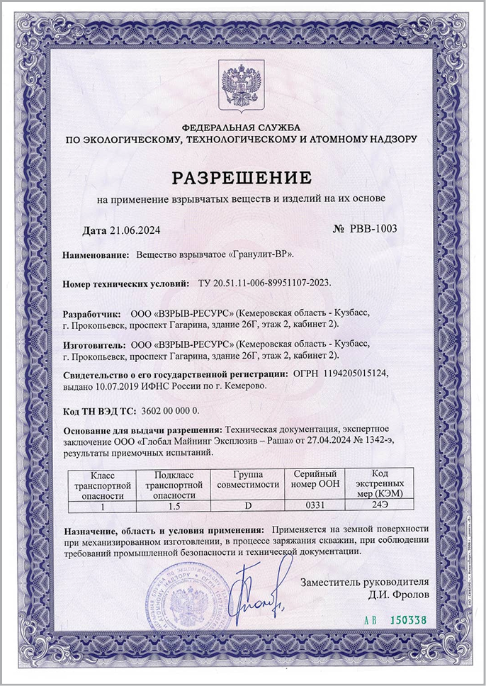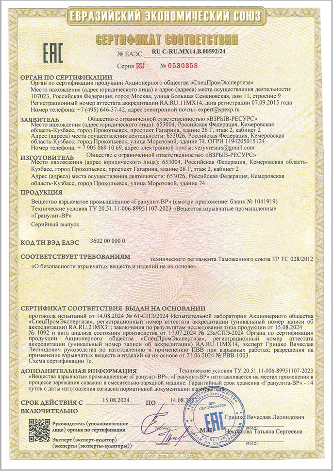 Изготавливается по ТУ 20.51.11-06-89951107-2023 из невзрывчатых компонентов непосредственно на месте применения в процессе заряжания скважин смесительно-зарядными машинами. Предназначено для производства взрывных работ на земной поверхности при отбойке сухих и осушенных горных пород с коэффициентом крепости по шкале М. М. Протодьяконова до 10. Нечувствителен к первичным средствам инициирования. Относится к 1 классу ВВ (непредохранительное ВВ)